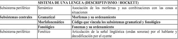 • De acuerdo con Hockett (138-9), la totalidad del sistema lingüístico se puede descomponer en cinco subsistemas principales, tres centrales y dos periféricos: